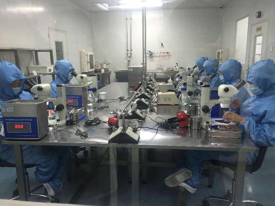 技術(shù)人員在密閉實驗室內(nèi)對眼科產(chǎn)品進行超聲波清洗。聶晨靜 攝