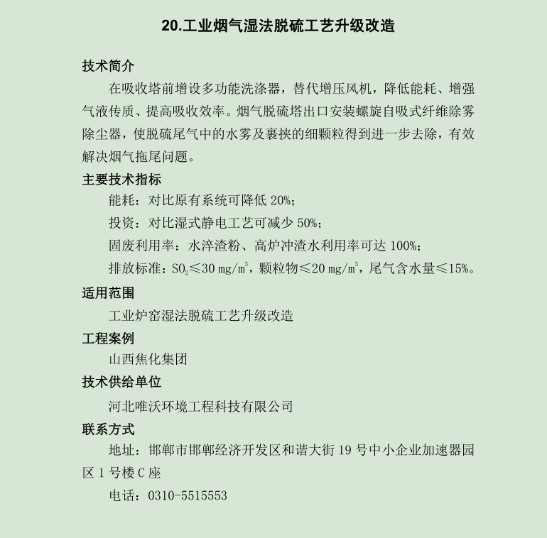 指導(dǎo)目錄中,唯沃入選的技術(shù)是“工業(yè)煙氣濕法脫硫工藝升級改造”,主要適用于工業(yè)爐窖濕法脫硫工藝升級改造,比原有系統(tǒng)降低20%的能耗,并且水淬渣粉、高爐沖渣水利用率可達100%,是科技治霾、精確治污的重要標志性技術(shù)之一。